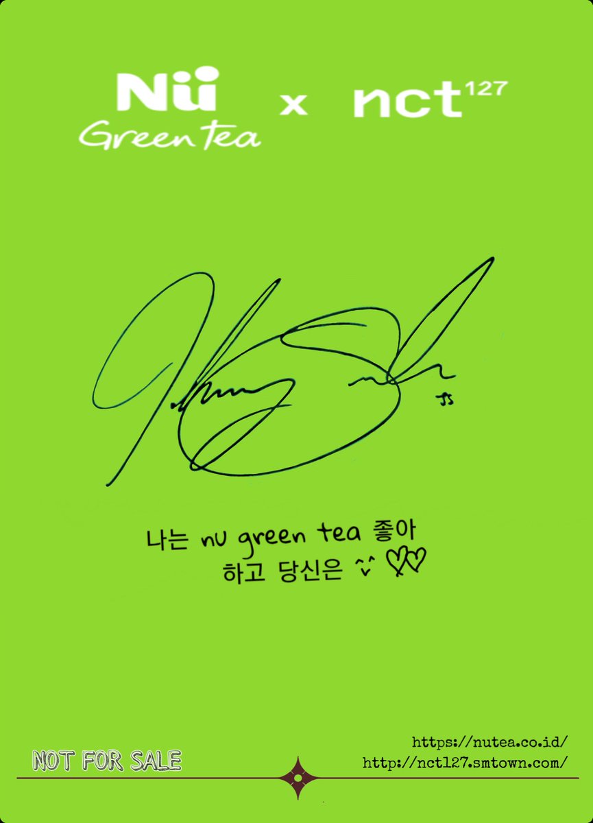Nu Green Tea juga mengeluarkan botol dengan kemasan wajah dari masing-masing anggota NCT 127 yang berjumlahkan sembilan orang. Random Member Card Random Group Card. NCT 127 jadi model minuman Indonesia.